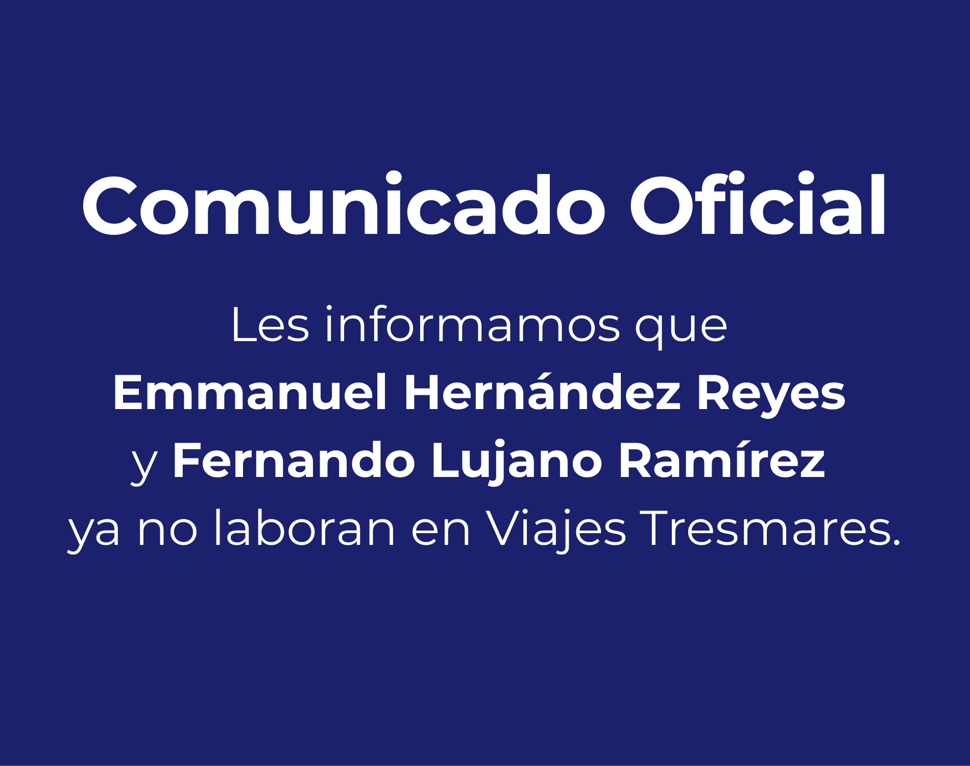 Les informamos que Emanuel Hernández y Fernando Lujano Ramírez ya no laboran en Viajes Tresmares, y no cuentan con autorización para gestionar, negociar, vender productos o servicios, cobrar anticipos, recibir documentación o realizar cualquier tipo de actividad en nombre de la empresa.